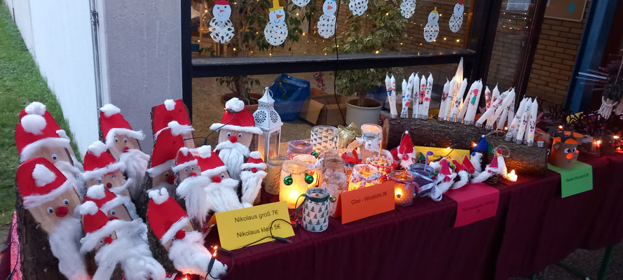 Eröffnet wurde der Weihnachtsbasar durch einen gemeinsamen musikalischen Beitrag aller Kinder: Drei fröhliche Weihnachtslieder erklangen und schufen sofort eine festliche Stimmung. Zudem richtete Frau Reichert herzliche Worte an die zahlreichen Besucher. Sie bedankte sich bei Kindern, Eltern und Lehrkräften, der Gemeinde und dem Bauhof für die tatkräftige Unterstützung und zeigte sich erfreut über die große Beteiligung der gesamten Schulgemeinschaft sowie vieler Freunde der Schule. Zum feierlichen Abschluss wurde noch das Adventsfenster, welches im Rahmen vom lebendigen Adventskalender von der Klasse 2b schön geschmückt wurde, eröffnet. Als besonderes Highlight konnte Herr Frensch vom Förderverein an diesem Tag das 50. Mitglied im Rahmen der Eröffnung begrüßen.