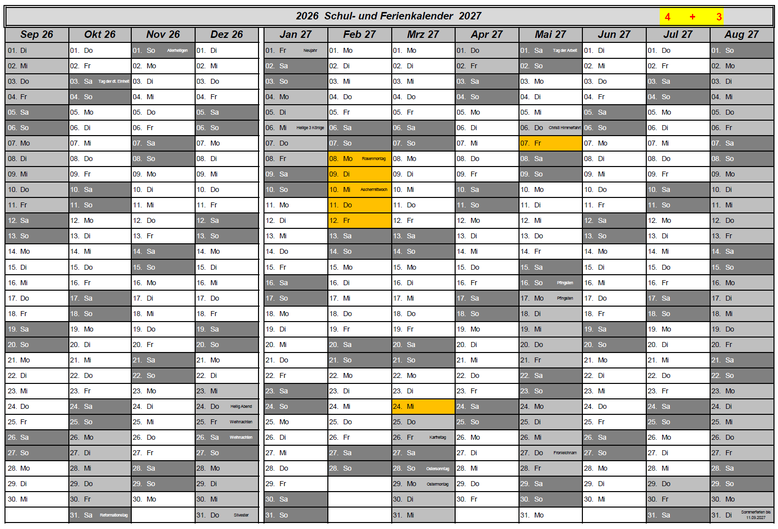 Schuljahreskalender 2026 - 2027 mit beweglichen Ferientagen